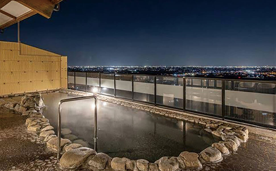 日本百名月・日本夜景遺産に認定された絶景を望む露天風呂。全11種類のお風を完備、満点の星空と湯に包まれる贅沢な癒し時間を。