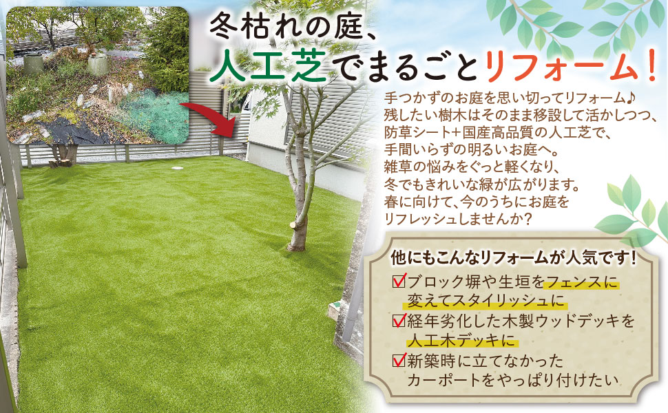 アフターケアも万全で、伸びすぎた植木の剪定・高さの調整から芝生のお手入れ、草刈り、植栽の消毒などお客様のご要望に合わせたお庭のお手入れを行ってくれるため、サポートもばっちり!