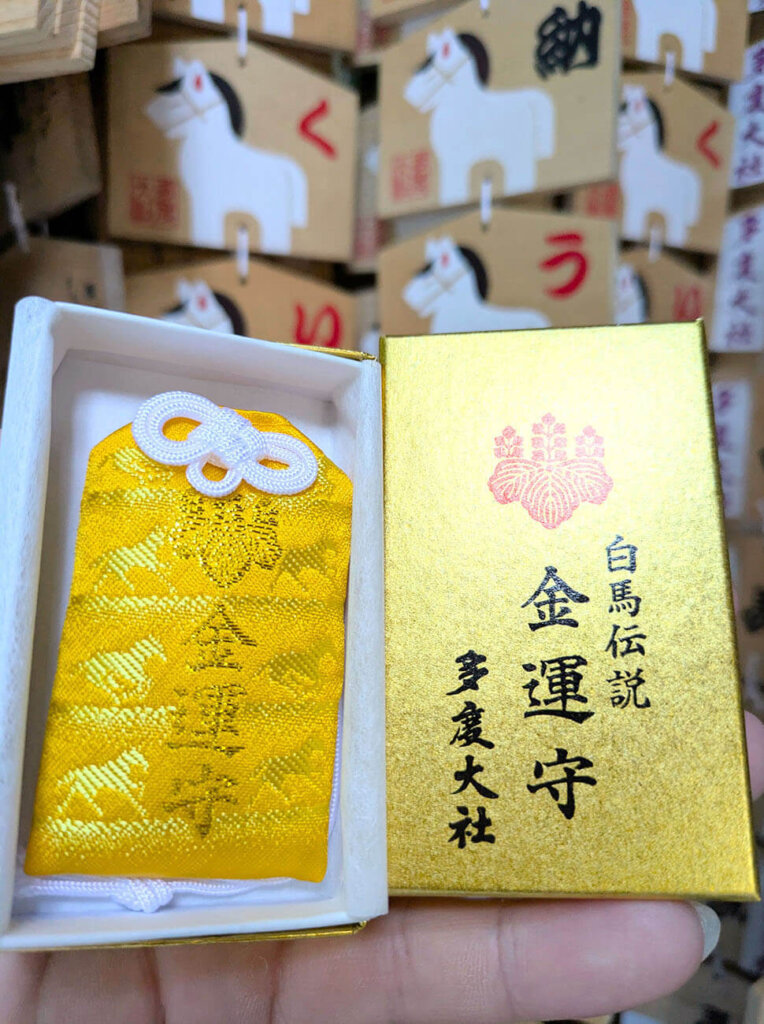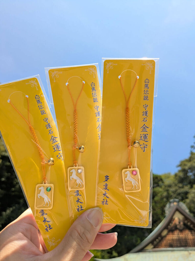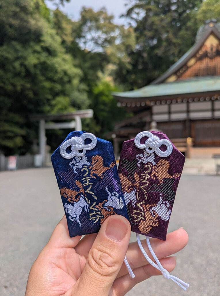 九頭の馬が描かれた縁起の良いお守り。馬だけに「うまくいく守」。家内安全や商売繁盛、厄除けなど様々な願い事の成就をサポートしてくれると人気です。