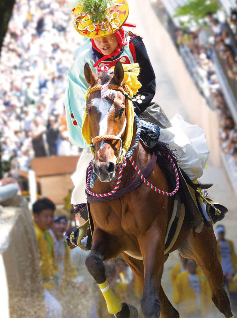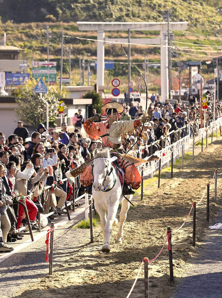 小笠原一門ご奉仕により執り行われる勇壮な神事です。馬上の射手が、インヨー(陰陽)の掛け声とともに三つの的を矢継ぎ早に射抜くこの神事は、天下泰平、国家安穏の祈りを込めて行われます。