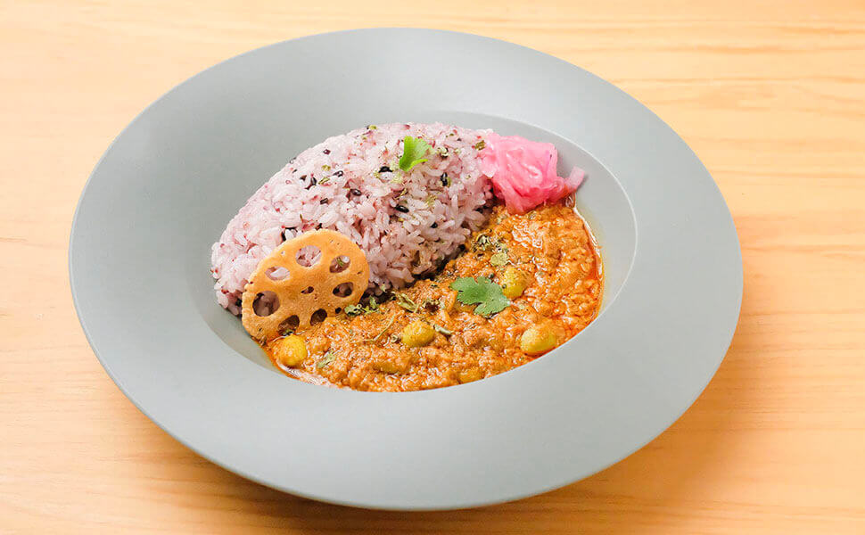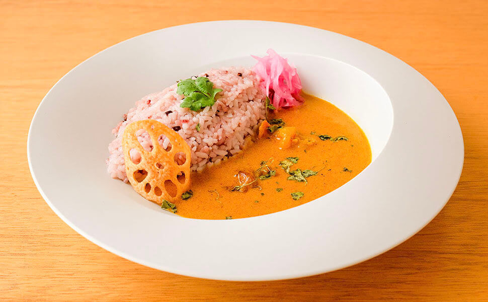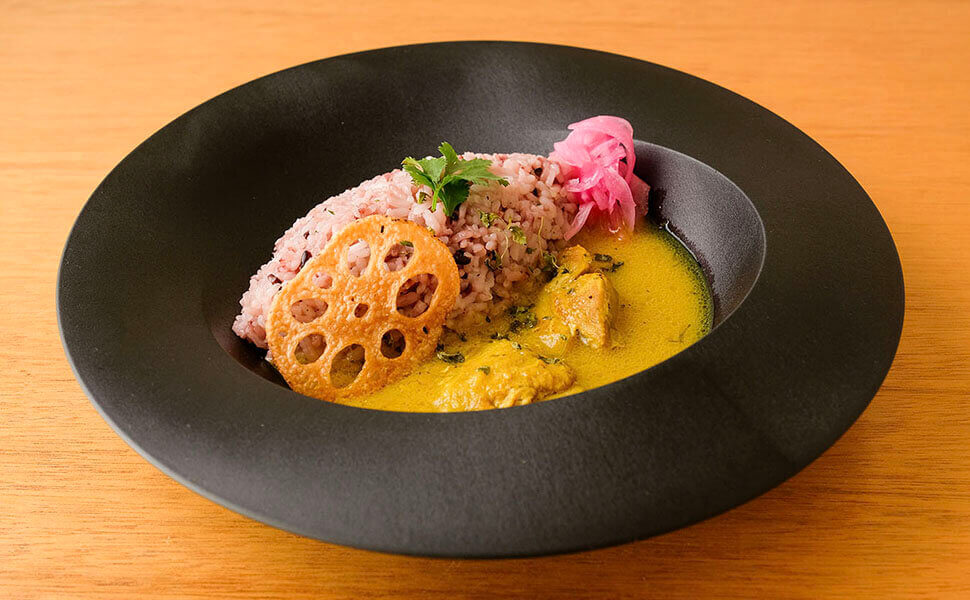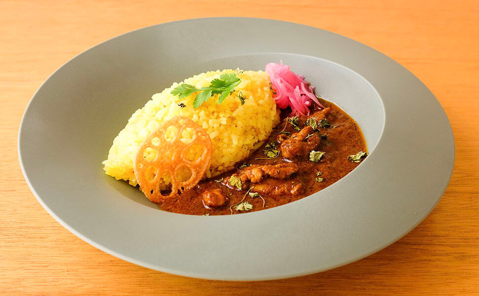スパイスをローストして深みを引き出した定番の「ブナチキンカレー」は、カレーの旨味の素となる玉ねぎを長時間ローストした奥深い旨味のチキンカレーです。(ブナ=ローストという意味です。)