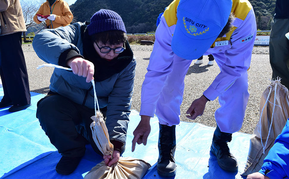 楽しみながら防災について考えてもらうイベント。来場者は長良水防団の団員から土のう袋の結び方を教わり、団員が炊き出し訓練として大鍋で作った豚汁を味わいました。