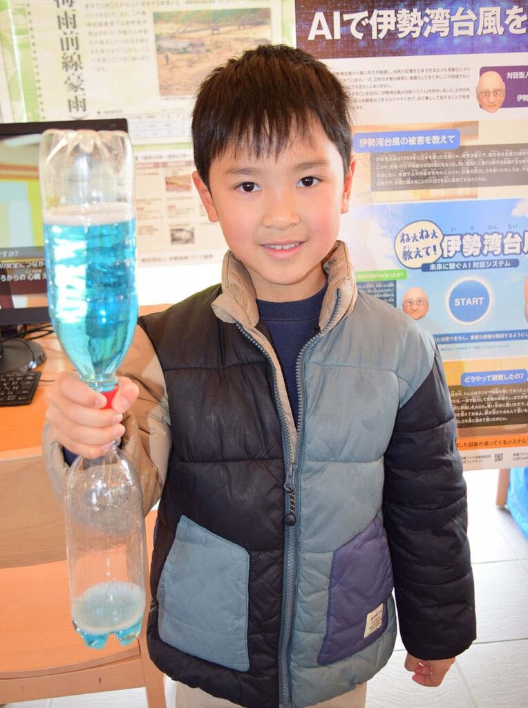 ペットボトルを使って実験し、竜巻の仕組みなどを学ぶコーナーもあった。
