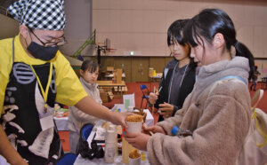 能登半島地震の被災地の復興支援を目的に、石川県輪島市の朝市組合のメンバーを招いた輪島朝市を、軽トラ市と同時開催しました。組合から9店舗が出店し、ノドグロ、フグの干物や輪島塗などを販売。会場にはカセットコンロが用意され、購入した一夜干しなどを早速焼いて味わう来店客もいました。