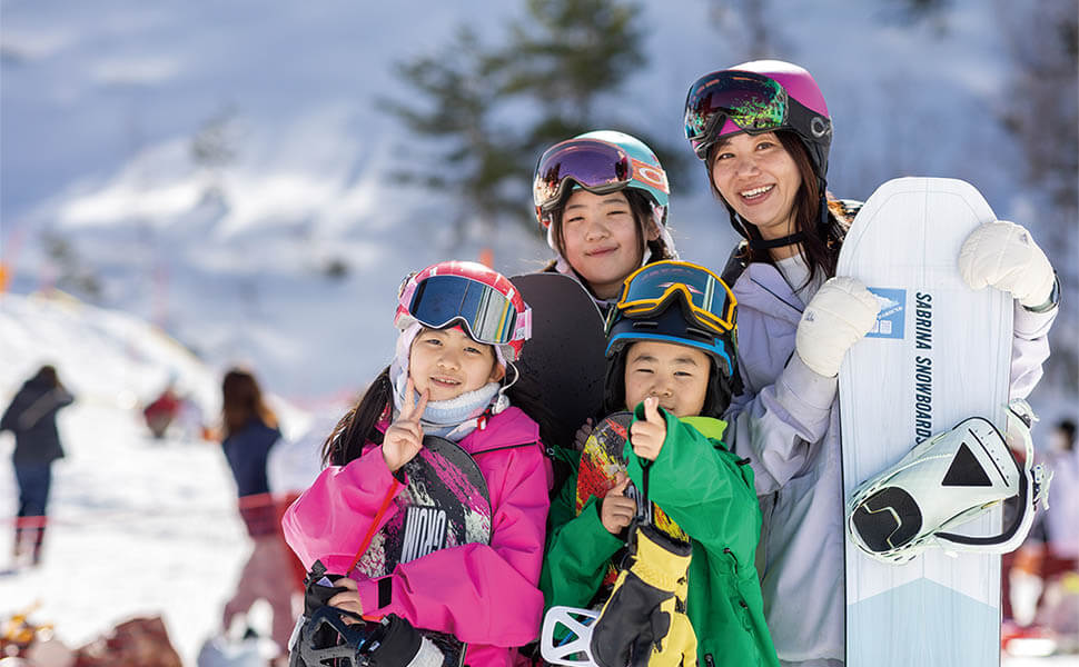 右手前は鷲ヶ岳スキー場のマスコットキャラクター「タケゾーくん」。一緒に記念撮影を楽しもう!(画像提供:鷲ヶ岳スキー場)