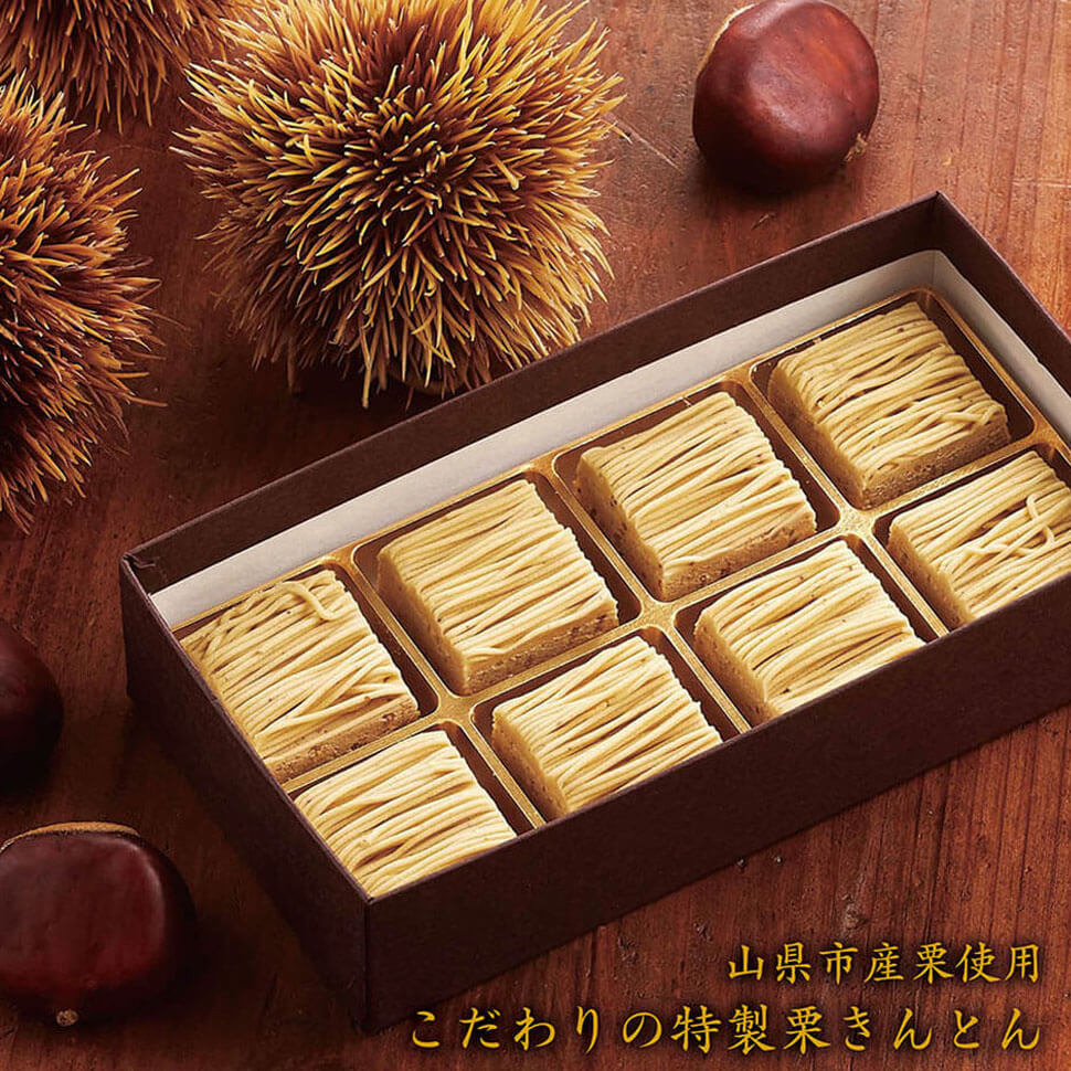 岐阜県産栗100%使用の「栗きんとん」は、職人がひとつひとつ丁寧に茶巾絞りで手作り。4個入りの箱売りと、2個入りとお好きなほうを選びましょう。
