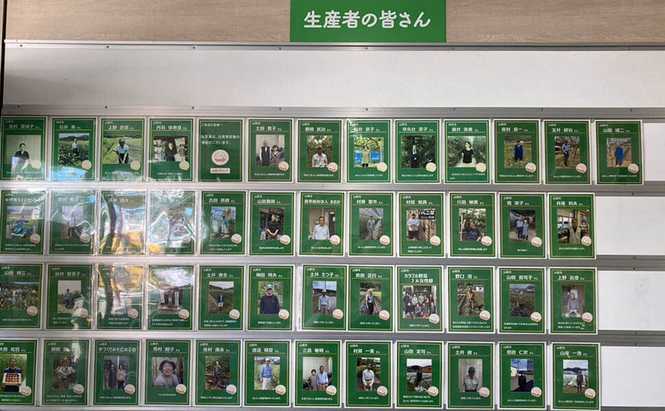 『山県ばすけっと』の売り場には、毎朝新鮮な野菜や果物がたくさん届きます。店内入り口には生産者さんのお顔写真も展示されていて、まさに地域密着型の販売所です。生産者さんのお顔をみると、込められている思いなども伝わって安心して美味しくいただけますね。