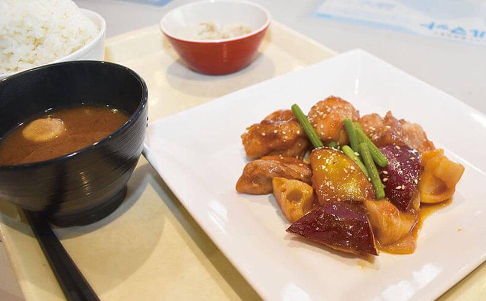 「さつまいもの甘みと鶏肉のピり辛味がよく合い、ごはんが進みます♪」食堂でモリモリ食べるスポーツ経営学科の学生。(©️SAKURA編集部)